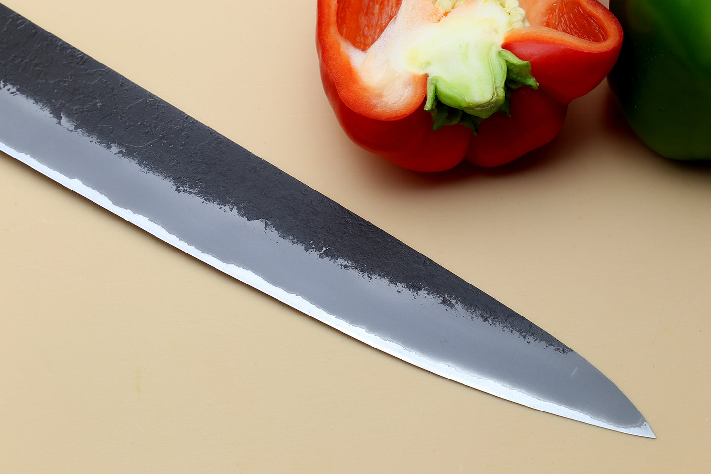 Our Yoshihiro Kurouchi Stainless Clad Knives exemplify the perfect marriage of traditional craftsmanship and modern metallurgy. Featuring a Kurouchi finish on stainless cladding, these knives maintain the rustic aesthetic of a "Black-Forged" blade without the upkeep challenges of high-carbon steel. The stainless cladding not only enhances durability but also protects against moisture while preserving the sharpness and strength of the blade. At their core, the knives are crafted with Blue Steel #2, a premium high-carbon steel with a hardness of 63 on the Rockwell scale, celebrated for its exceptional edge retention and sharpness that withstands prolonged use.