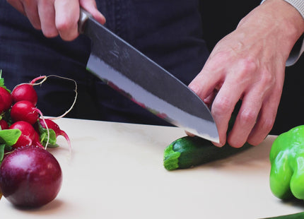 Our Yoshihiro Kurouchi Stainless Clad Knives exemplify the perfect marriage of traditional craftsmanship and modern metallurgy. Featuring a Kurouchi finish on stainless cladding, these knives maintain the rustic aesthetic of a "Black-Forged" blade without the upkeep challenges of high-carbon steel. The stainless cladding not only enhances durability but also protects against moisture while preserving the sharpness and strength of the blade. At their core, the knives are crafted with Blue Steel #2, a premium high-carbon steel with a hardness of 63 on the Rockwell scale, celebrated for its exceptional edge retention and sharpness that withstands prolonged use.