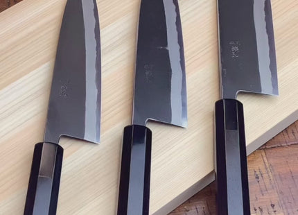 Experience culinary excellence with our handmade Yoshihiro Blue High Carbon Steel #2 Kurouchi Series Santoku Japanese Multipurpose Knife. This exceptional knife exemplifies intricate forging, layering, and hammering techniques, crafted using the traditional Kurouchi method. Its black-forged style not only reflects quality but also showcases the artistry of Japanese knife-making.