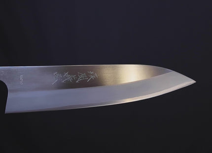 Our Yoshihiro HAP40 High Speed Stainless Steel Gyuto is a handcrafted Japanese chef's knife designed to offer unparalleled performance. HAP40 (Funmatsu Haisu) stainless steel stands out in the market, maximizing cutting efficiency and edge retention like few others. The high-speed steel core, rated at a Rockwell hardness of 65-66, ensures that this knife maintains its superior sharpness over time.