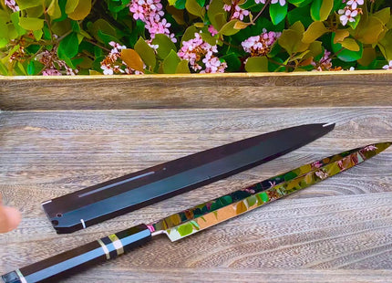 The Yanagi is a long slicing knife specifically designed for effortlessly cutting thin slices of fish for sushi and sashimi, making it an indispensable tool for any chef. The beauty of its slender, sharp blade lies in its ability to glide through ingredients with long, uninterrupted strokes, preserving their integrity and freshness. With a slightly heavier, wider blade featuring a thicker spine, the Yanagi's design ensures perfect balance, making it an ideal choice for chefs working in tighter spaces. Elevate even the simplest culinary tasks with this handcrafted knife, combining beauty and functionality.