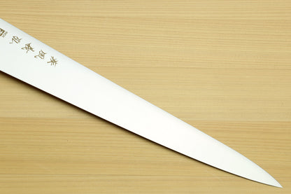 Discover the excellence of the Yoshihiro Inox Sujihiki, expertly forged from a single piece of AUS-10 stainless steel with a semi-stainless steel finish. This double-edged Sujihiki slicer features a premium octagonal-shaped stabilized maple burl handle and is built for commercial kitchens. With a carbon content of over 1%, it offers superior edge retention, toughness, and ease of sharpening, setting it apart from competitors.