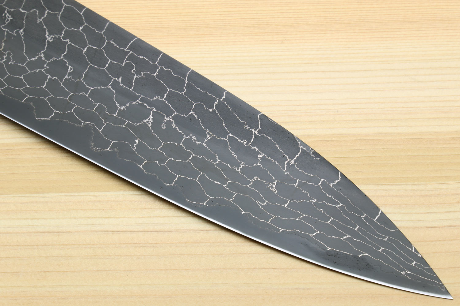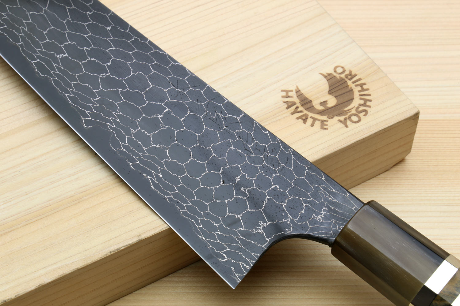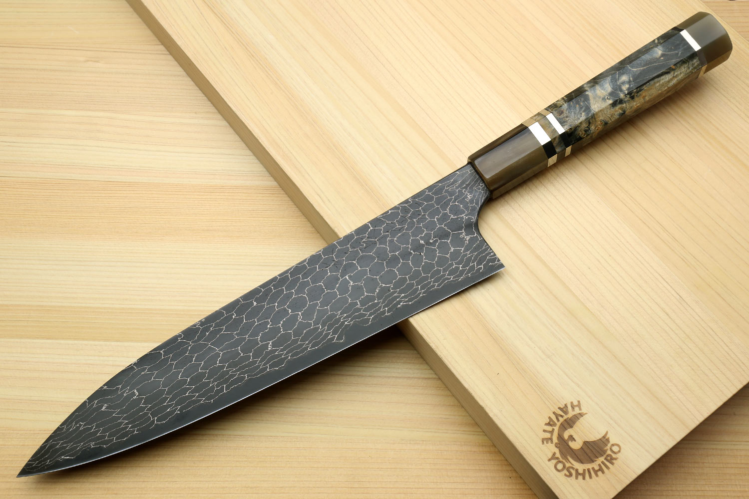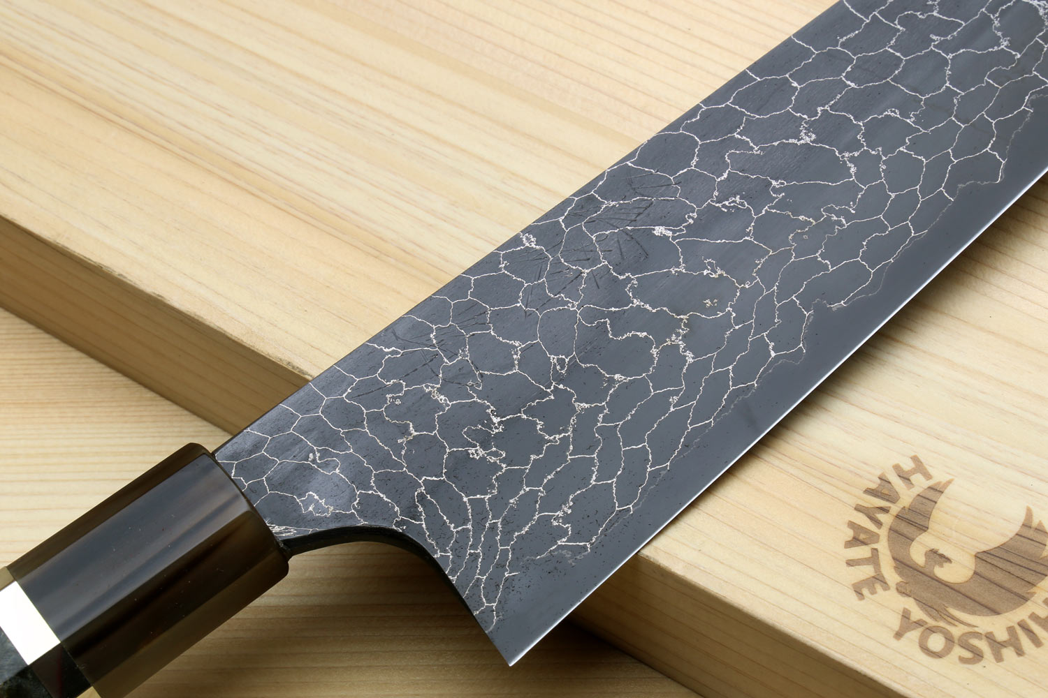 Yoshihiro Mazaki Hon-Sanmai Snake Skin Pattern Damascus Kurouchi Black-Forged Blue Steel Gyuto Chefs Knife, Mazaki Limited Edition (Blade Length: 240mm)