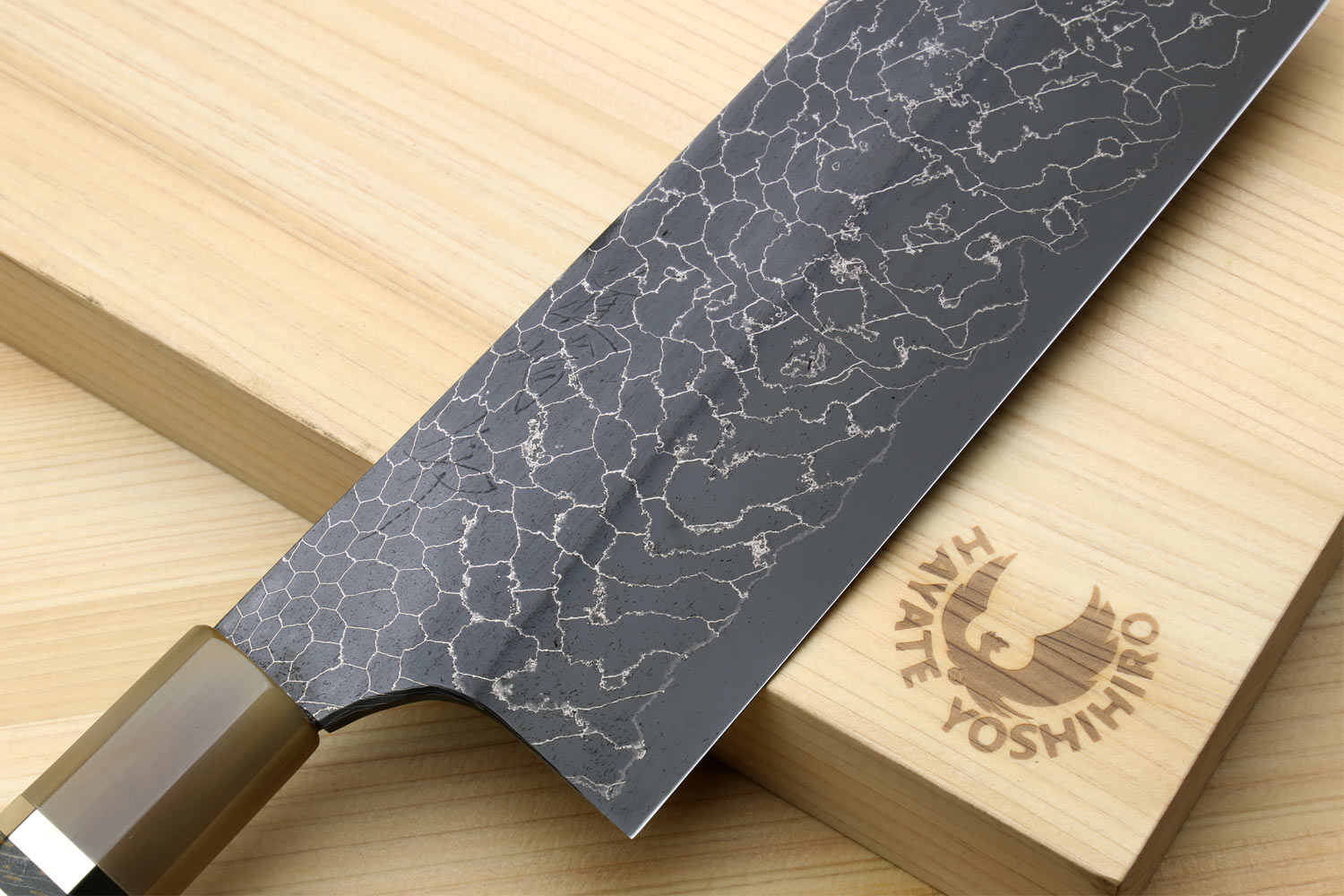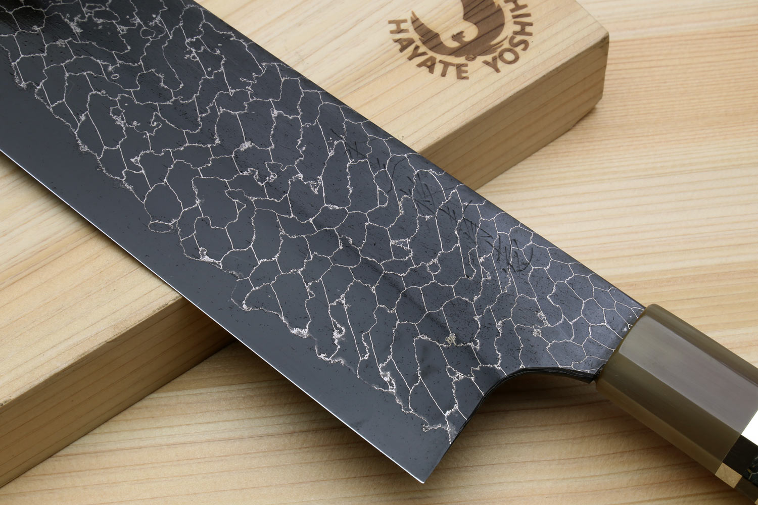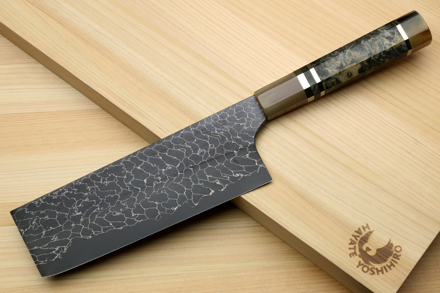 Yoshihiro Mazaki Hon-Sanmai Snake Skin Pattern Damascus Kurouchi Black-Forged Blue Steel Nakiri Vegetable Knife, Mazaki Limited Edition (Blade Length: 165mm)