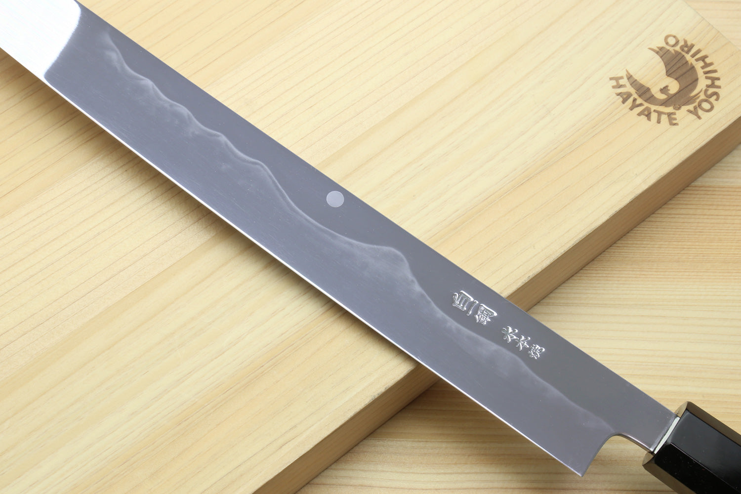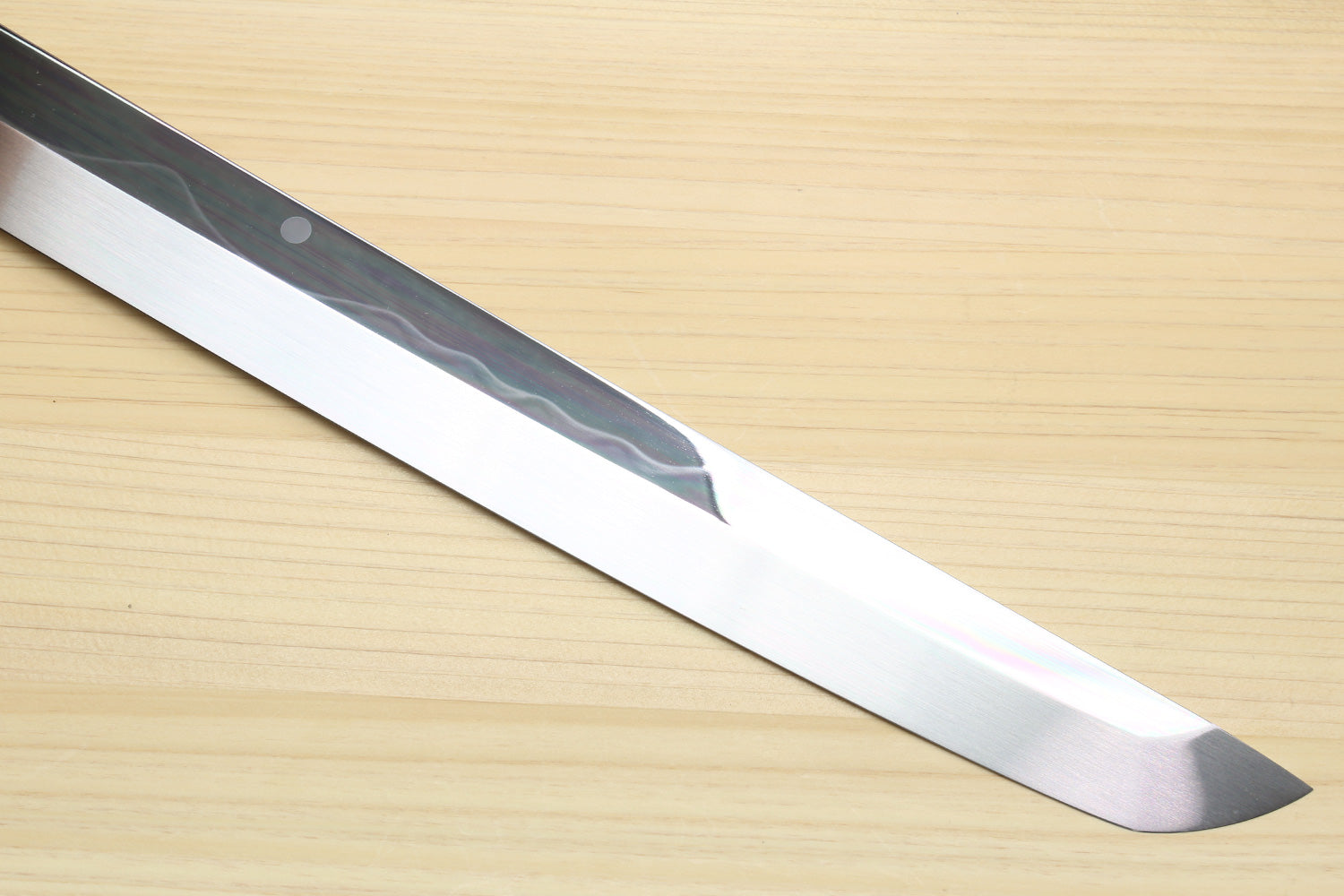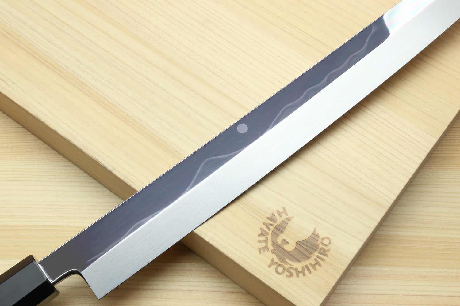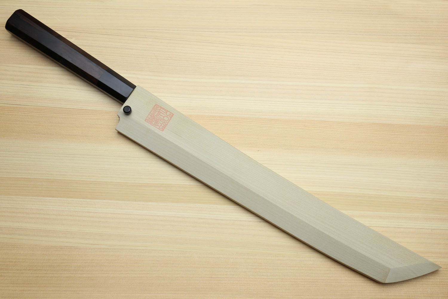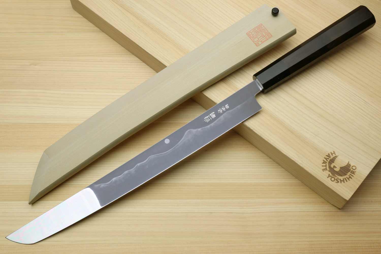 The Sakimaru Takobiki is a traditional long slicing knife designed for precision cuts of sashimi and delicate fish preparation. Its extended, slender blade allows for clean, uninterrupted strokes that preserve texture and freshness. The distinctive sakimaru tip offers enhanced control and refinement, making it especially favored by professional sushi chefs. This knife excels in environments where accuracy and presentation matter most, combining classical form with exceptional cutting performance.