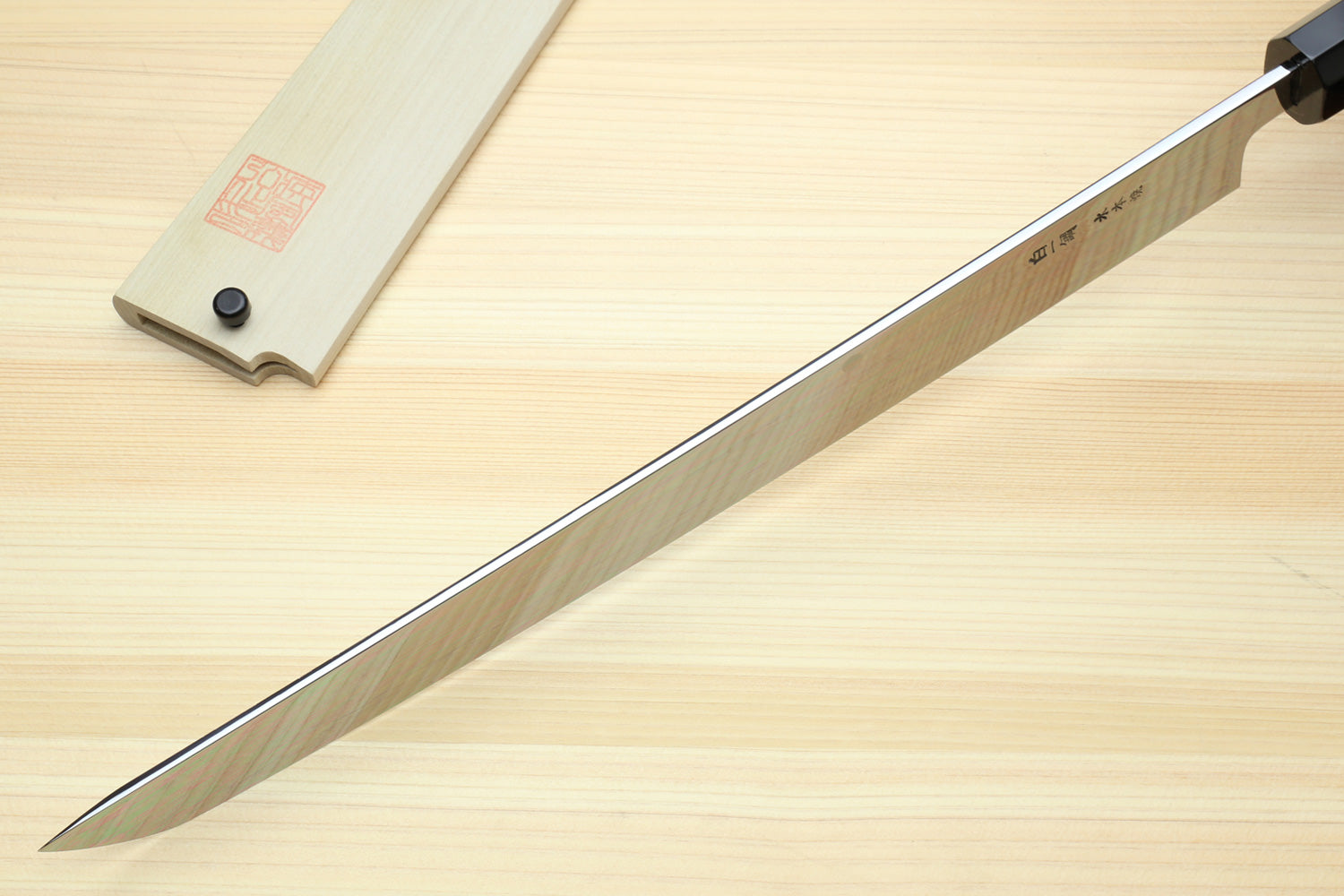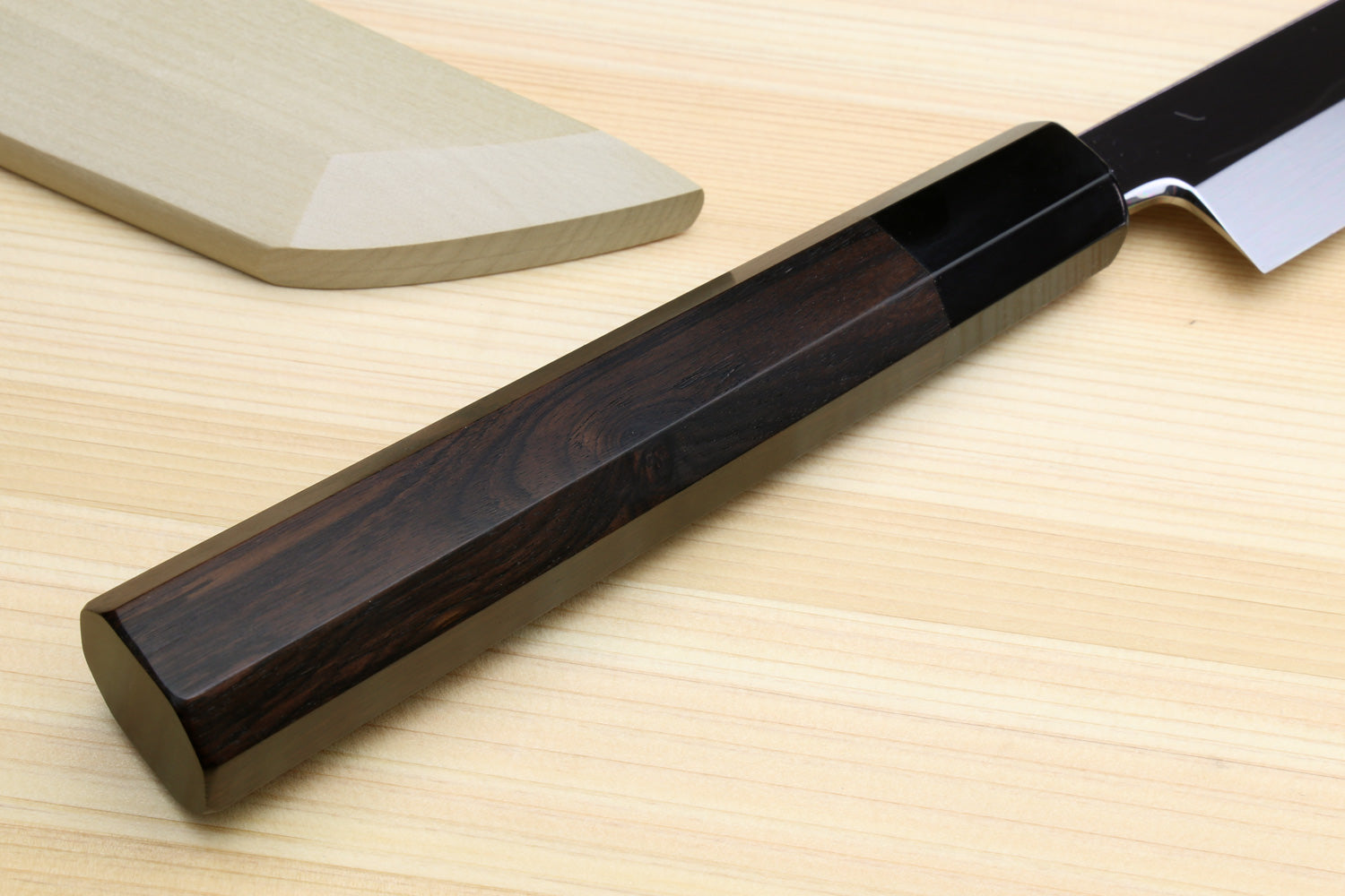 Each Yoshihiro Honyaki knife is finished with a handcrafted premium ebony wood handle, accented by a natural water buffalo horn bolster. A protective wooden sheath, known as a Saya, is included to safeguard the blade and maintain its elegance when not in use.