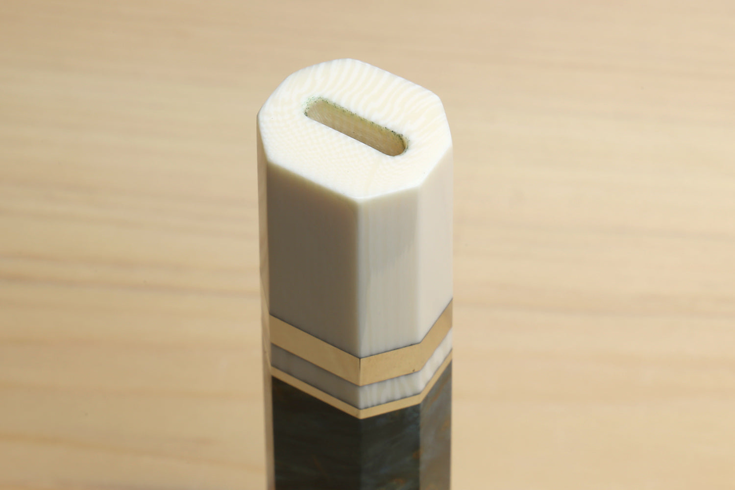Available for blade lengths of 180mm and 210mm, this handle allows you to customize your knife to meet your specific needs. Crafted with luxurious Ocean Blue design, the octagonal design not only enhances grip but also adds a touch of timeless elegance to your kitchen tools. The Ivory White Bolster beautifully complements the rich wood grain, creating a seamless fusion of beauty and durability.