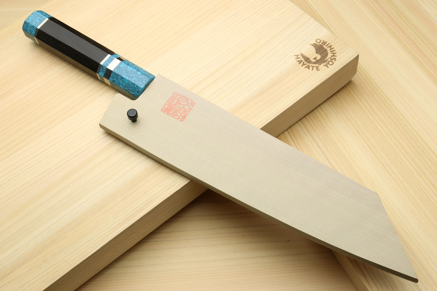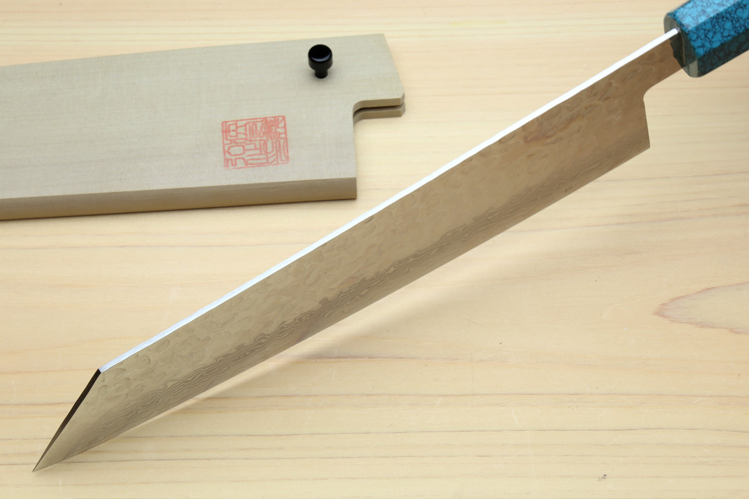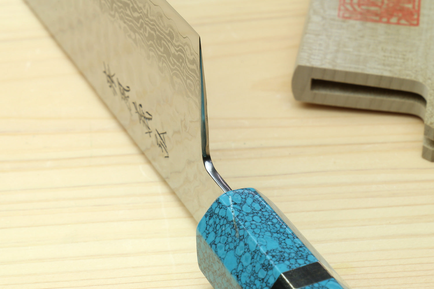 Its traditional Wa-style octagonal Turquoise Blue handle, crafted from ebony with a turquoise bolster, is ergonomic and lightweight, fitting naturally in the hand for comfortable, extended use. The included wooden Saya sheath protects the blade while adding to its elegant presentation. The hammered blade reduces friction and prevents food from sticking, ensuring smooth, precise cutting.