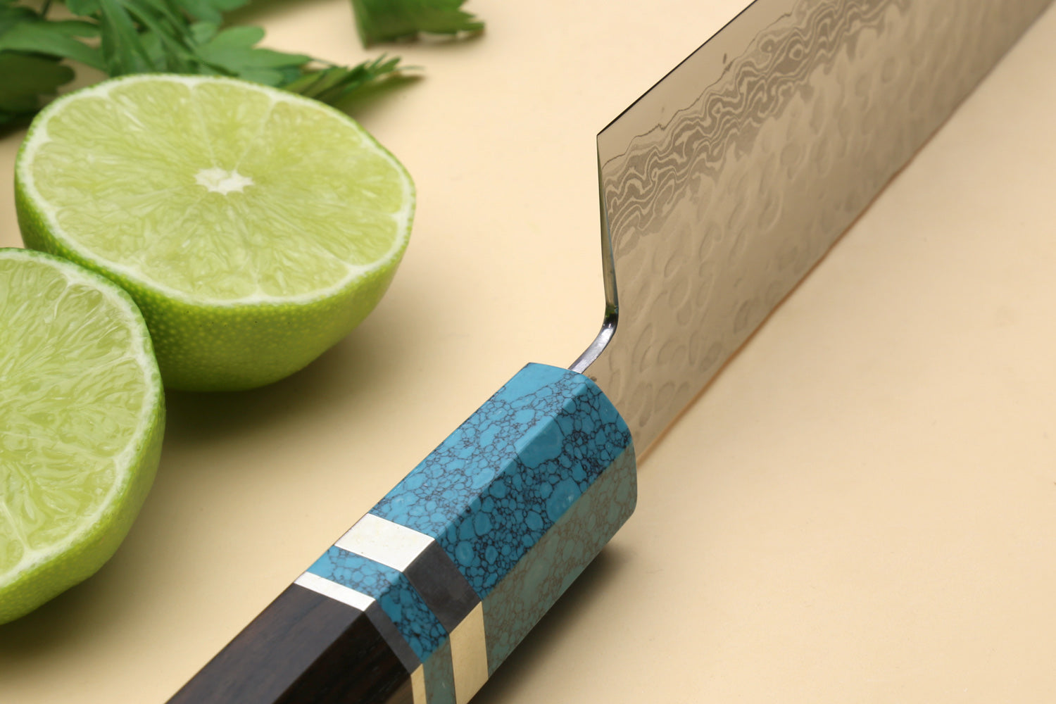 Our VG-10 Hammered Damascus Santoku Knife is crafted with 46 layers of steel in the Damascus tradition, featuring a VG-10 Core and a polished stainless steel finish. Complemented by a traditional Japanese style handcrafted Octagonal Turquoise Blue Handle, this knife is further enhanced with a double Turquoise blue bolster for added durability and beauty.