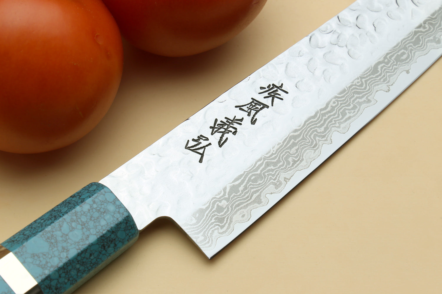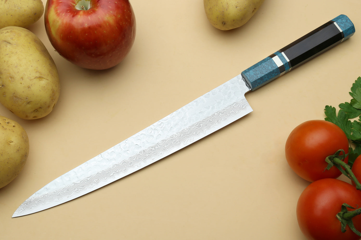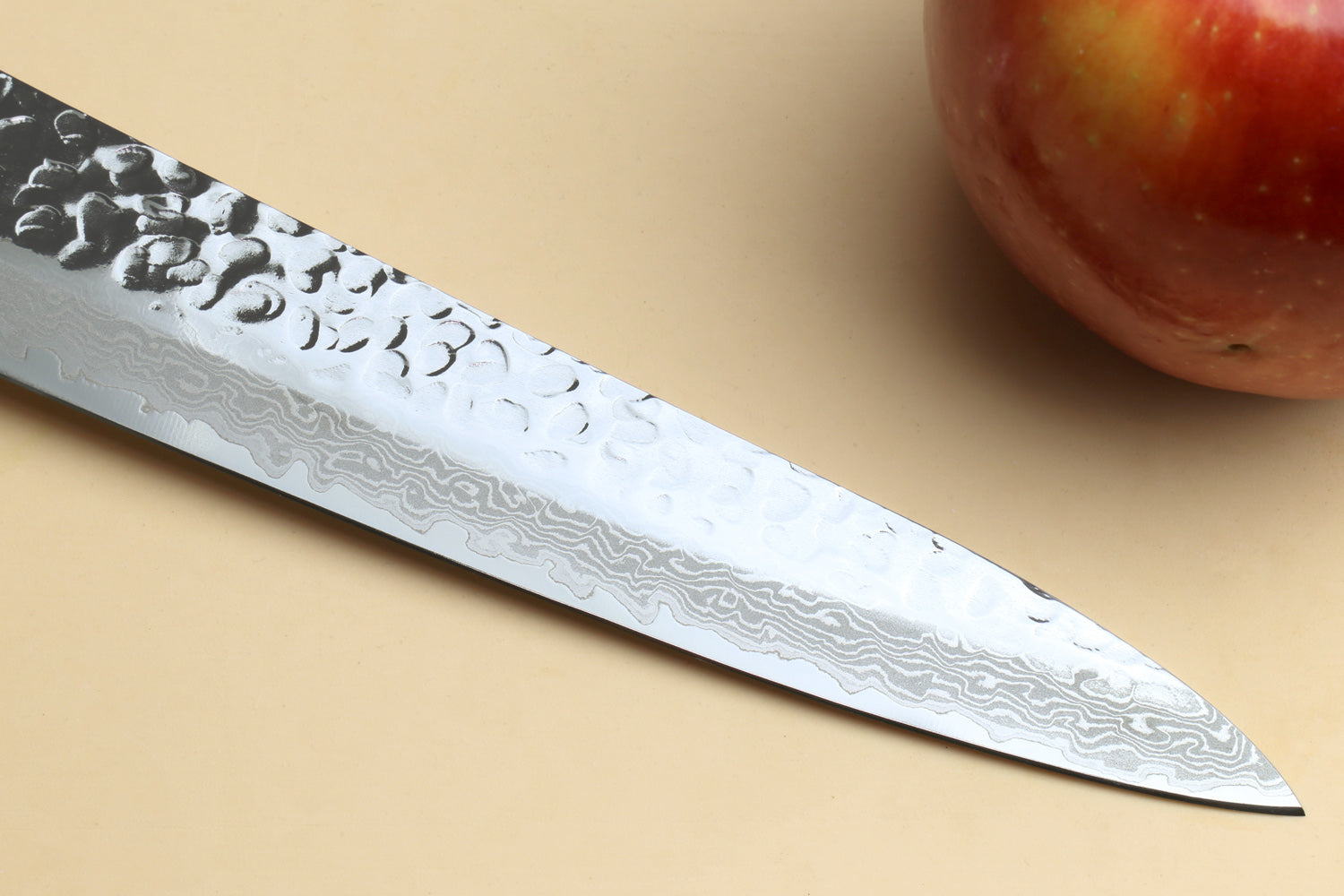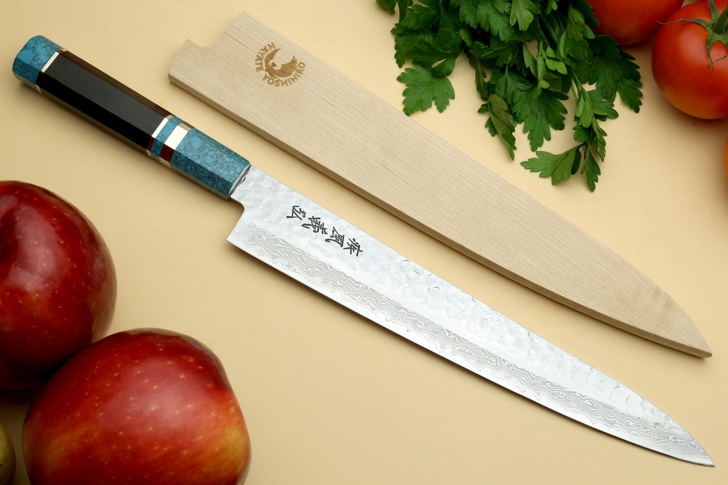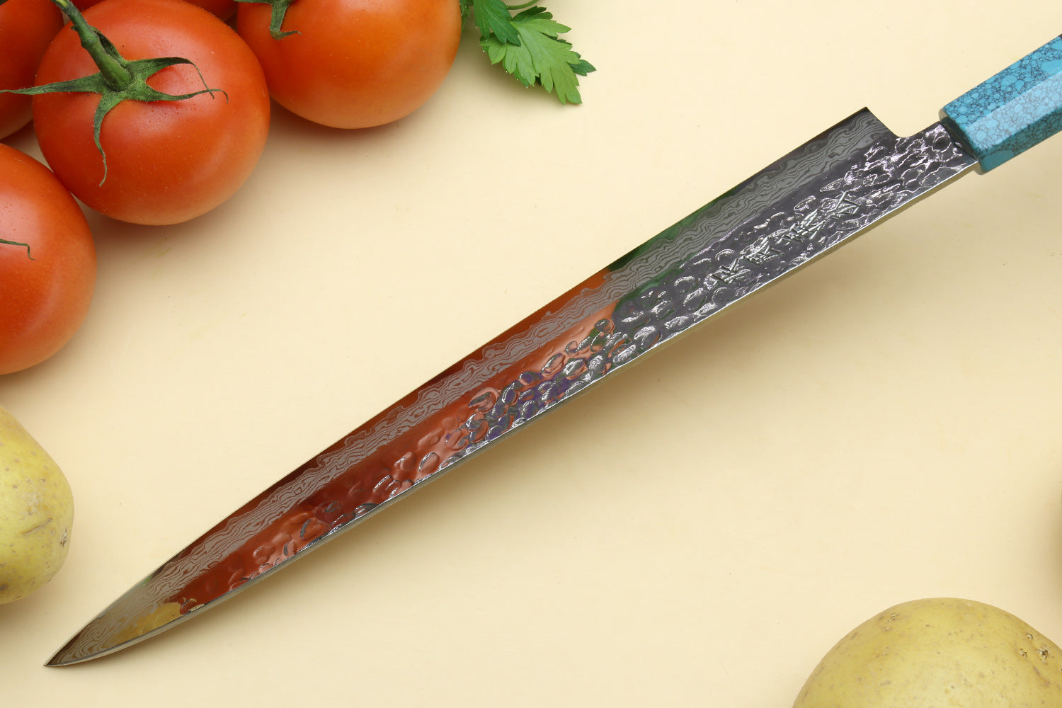The Yoshihiro NSW Hammered Damascus VG-10 Sujihiki Slicing Knife is a stunning and functional tool, forged with 46 layers of steel in the Damascus tradition and featuring a VG-10 core. This process creates a striking appearance with unique waves and a hammered texture, ensuring each knife is not only visually captivating but also durable and stain-resistant. The exceptional craftsmanship offers superior sharpness, edge retention, and ease of sharpening, making it a perfect choice for both entry-level and professional chefs.