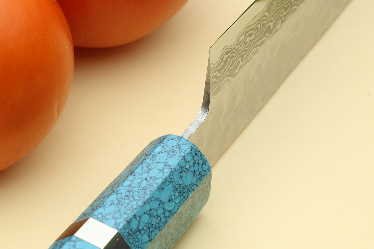 The Octagonal Turquoise blue handle, complemented by an ebony wood bolster, is carefully handcrafted for a comfortable grip, ensuring balance and control as you slice through meats, fish, and vegetables with precision. The handle's ergonomic design allows for extended use without discomfort, providing a seamless experience in high-paced kitchen environments.