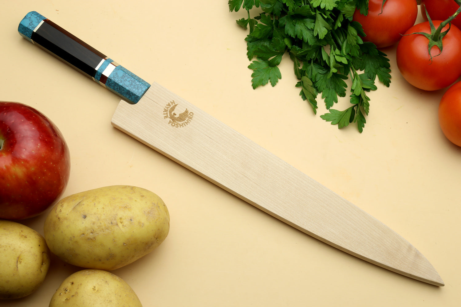 This knife is easy to maintain and will easily glide through foods, thanks to its thinner blade compared to traditional German knives. A magnetic maple wood Saya cover is included to protect the blade when not in use. This knife is highly recommended for anyone looking to elevate their slicing game, offering both beauty and performance. For optimal maintenance, we recommend using a sharpening stone.