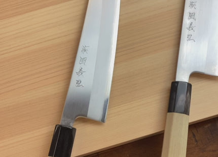 The stainless steel cladding enhances the blade's resilience, making it more forgiving to moisture exposure while ensuring superior edge retention and sharpness remain intact. The Santoku knife features a round tip and a shorter, thinner blade, making it perfect for home cooking. "Santoku" literally means "three virtues," signifying its versatility for use with meat, fish, and vegetables. Each knife from Yoshihiro is handcrafted by master artisans, creating a unique one-of-a-kind work of art.